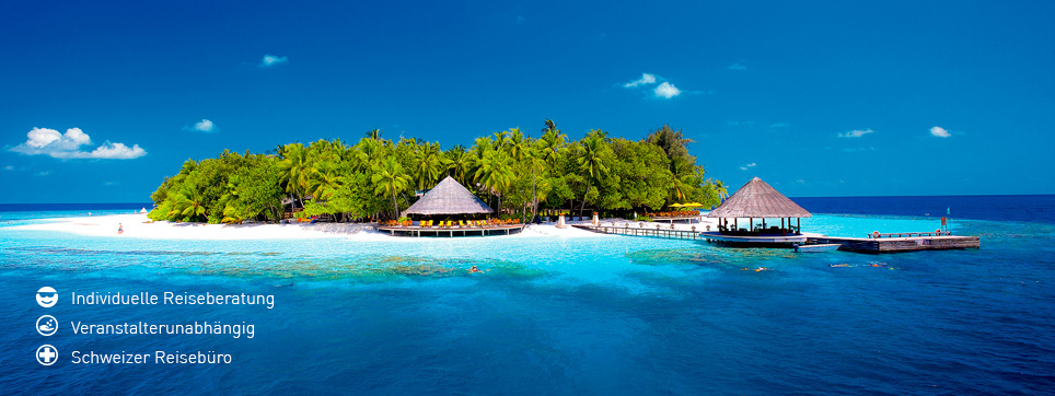 Mitten im Indischen Ozean befindet sich das traumhaft schöne Ferienparadies der Malediven. Hunderte kleiner Inseln heissen Sie willkommen und legen Ihnen weisse Sandstrände, kristallklares Meerwasser und unberührte Tropenwälder zu Füssen. Lassen Sie Ihre Reiseträume wahr werden und verbringen Sie unvergessliche Tage inmitten der idyllischen Kulisse einer Robinson-Insel. Lassen Sie sich mit einem erfrischenden Cocktail in der Hand die Seeluft um die Nase wehen und geniessen Sie den weiten Blick hinaus aufs türkisblaue Meer. Dank der Erfahrung unserer Spezialisten erholen Sie sich schon bei der Planung Ihrer Malediven Ferien, denn wir unterstützen Sie tatkräftig bei der Wahl der perfekten Insel für Ihre ganz persönlichen Ferienwünsche!